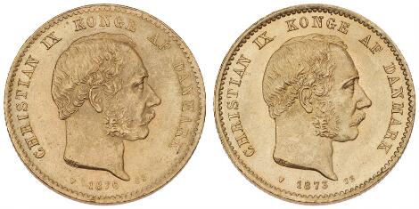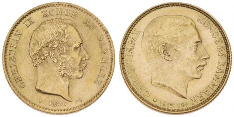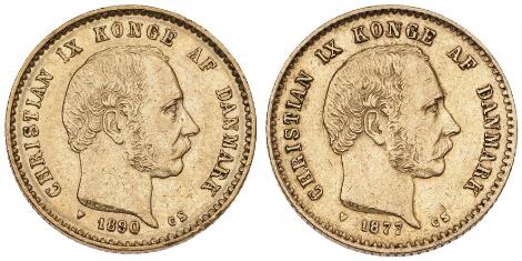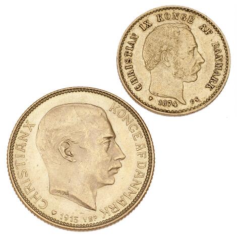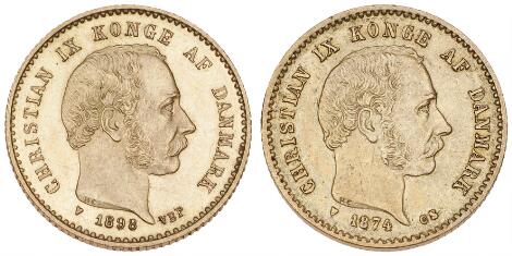 2545/515110 kr 1874 CS, H 9A, F 296; Christian X, 20 kr 1915 VBP, H 1A, F 299, i alt 2 stk.
