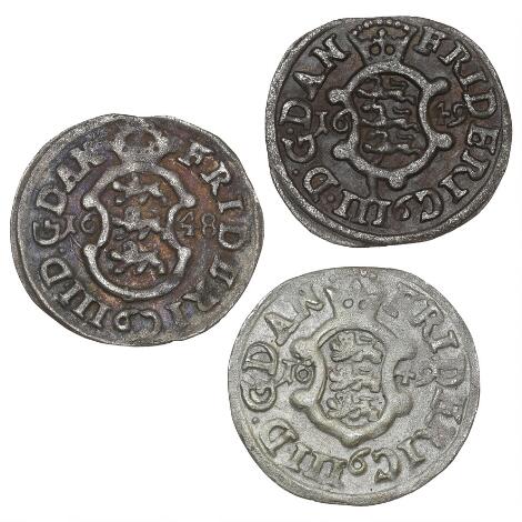 2545/5109Frederik III, 2 skilling 1648, 1649, 1649, H 122A, 124, 126B, Aagaard 5c, 11b, 15a, i alt 3 stk - pæne eksemplarer