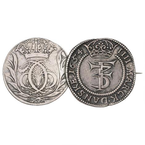 2545/5105Broche af to mønter, Frederik III, 4 mark / krone 1654, H 95A, og Christian V, Glückstadt, 4 mark / krone 1693, H 125B, Sieg 138.2. (2)