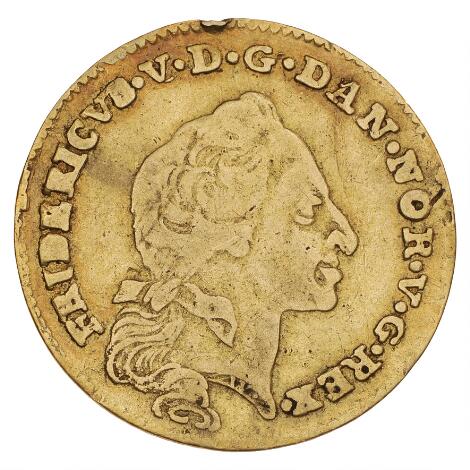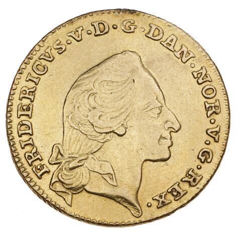 2545/5130Frederik V, kurantdukat / 12 mark 1759 W / VH, H 22C, monteringsspor ved kant over kongens portræt