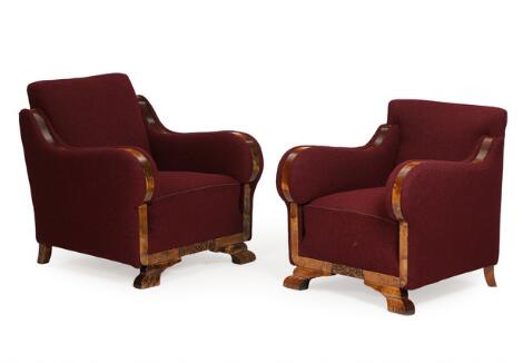 Danish cabinetmaker: Two Art Deco easy chairs with stained birch frames, upholstered in burgundy fabric. 1920s. (2)