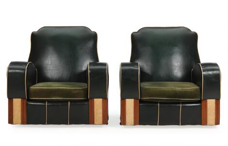 Unknown furniture design: A pair of Art Deco easy chairs on castors, upholstered with green artificial leather. 1950s. (2)