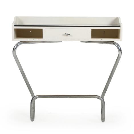 Danish furniture design: Funkis dressing table of white painted wood, black glass top, chromed steel tube frame. 1930-40s. H. 79. W. 80. D. 32 cm.