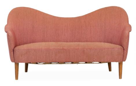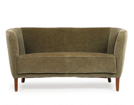 Danish furniture design: Two-seater sofa with curved front and stained beech legs. Model 44/713. 1930–40s. L. 130 cm.