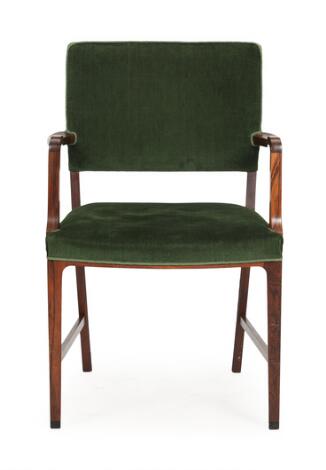 Danish furniture design: Armchair with rosewood frame, upholstered in seat and back with green velour. 1950s.