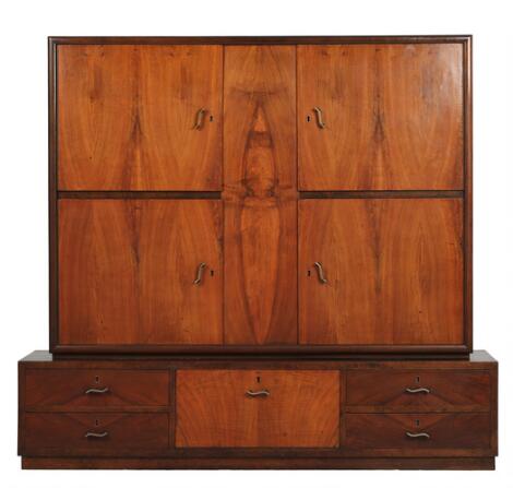 Danish furniture design: Art Deco tableware cabinet of stained birch with walnut fronts. 1930-40s. H. 135. W. 150. D. 43 cm.