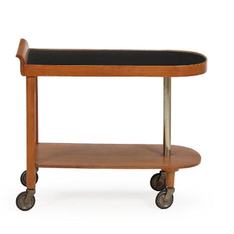 Danish furniture design: An Art Deco serving trolley of oak mounted on castors. Top of black glass. H. 60 cm. L. 74 cm. B. 42 cm.