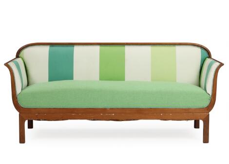 Danish furniture design: Art Deco sofa with a mahogany frame, upholstered in striped and green fabric. 1940s. L. 182 cm.