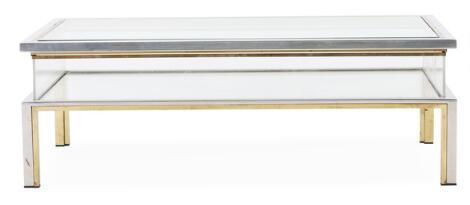 Maison Jansen: Brass and chromed metal coffee table. Glass top and underlying shelf. 1970s.