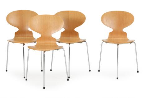 Arne Jacobsen: “The Ant Chair”. Set of four three legged dining chairs with oak seat and back, steel frame. Manufactured and marked by Fritz Hansen, 1974. (4)