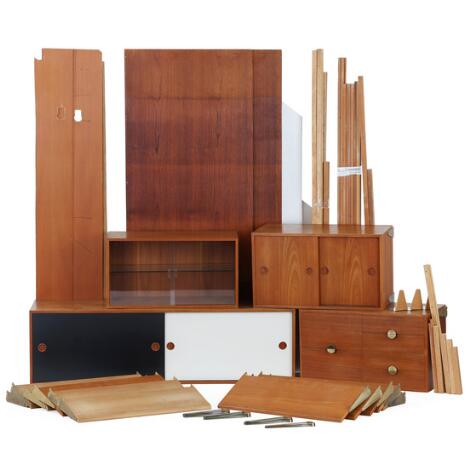 Finn Juhl: A teak wall unit comprising two panels, strings, 11 shelves, two cabinets with sliding doors, display cabinet and a chest of drawers.