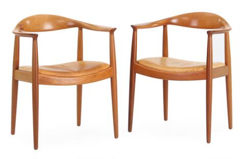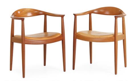 2549/964Hans J. Wegner: “The Chair”. A pair of mahogany armchairs. Seat upholstered with patinated, natural leather. (2)
