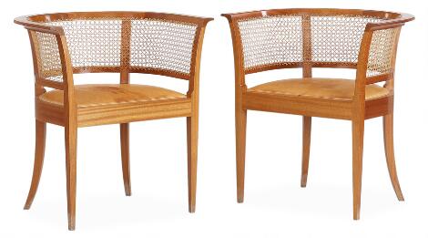 2549/946Kaare Klint: “The Faaborg Chair”. A pair of mahogany armchairs, sides and back with woven cane. Seat upholstered with natural leather. (2)