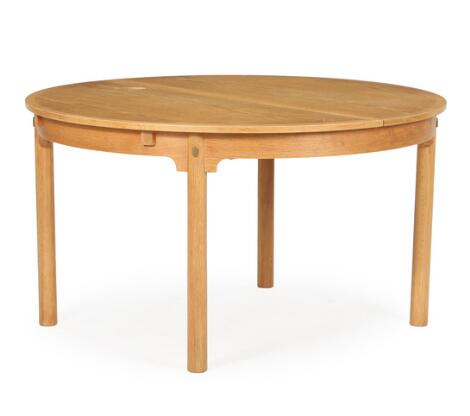 2549/974Børge Mogensen: "Øresund". Circular oak extension table with two foldable leaves. H. 72. Diam. 130. L. 216 cm. (3)
