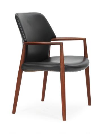 2549/977Ejner Larsen, Aksel Bender Madsen: A teak armchair, seat and back upholstered with black artificial leather. Made by cabinetmaker Willy Beck.
