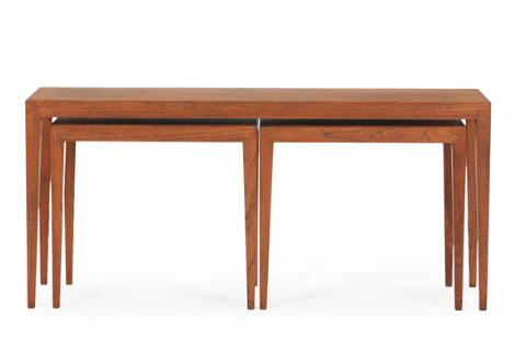2549/973Severin Hansen Jr.: Three stained teak nesting tables. Haslev Møbelsnedkeri. H. 50. L. 110. W. 32 cm. (3)