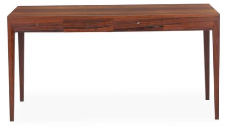 2549/633Severin Hansen Jr.: Fritstående skrivebord af riopalisander, opsat på tilspidsende ben. Front med fire skuffer.