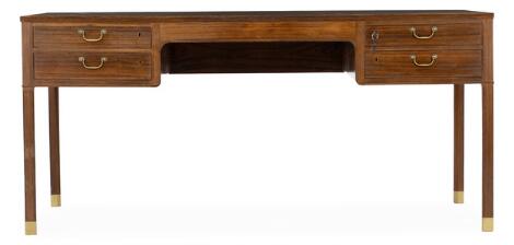 2549/636Ole Wanscher: Fritstående skrivebord af riopalisander med profilerede kanter. Front med fire skuffer. Greb samt “sko” af messing.