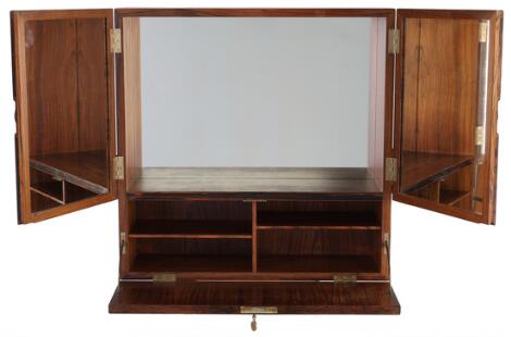 2549/648Tove & Edvard Kindt-Larsen: “Ung dame søges”. Væghængt toiletskab af Rio-palisander, front med to døre og klap, bag hvilke spejl og hylder.