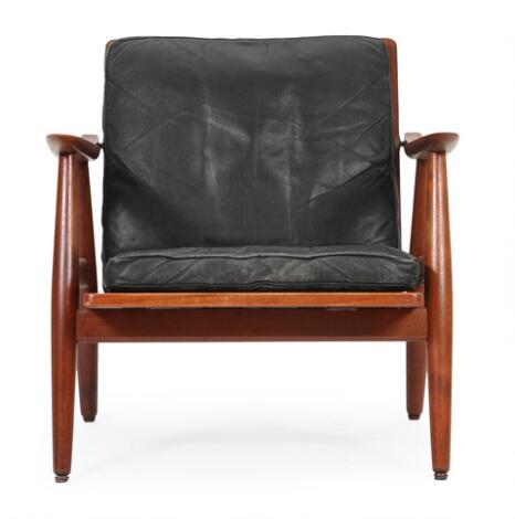 2549/674Hans J. Wegner: “GE 270”. Lænestol af teak. Løse hynder betrukket med sort skind. Udført hos Getama. 1960'erne.