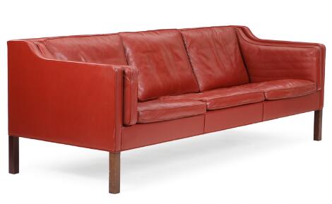 2549/683Børge Mogensen: Tre-personers sofa med ben af mahogni, rødbrunt skind. Fredericia Stolefabrik. L. 221.