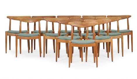2549/512Hans J. Wegner: "W1". Et sæt på 12 stole med stel af eg, betrukket i sæder med grønt uld. (12)