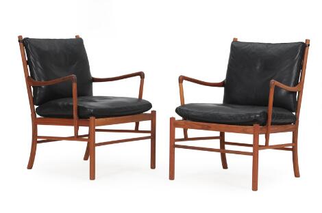 2549/596Ole Wanscher: "Colonial". Et par armstole af valnød, løse hynder med sort skind. Udført hos Carl Hansen & Søn. (2)