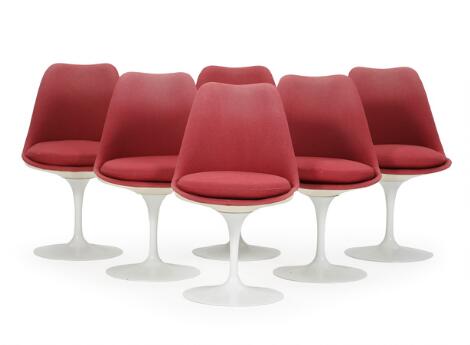 2549/551Eero Saarinen: “Tulip”. Sæt på seks stole af hvidlakeret metal med skal af glasfiber, betrukket med rødligt uld. (6)