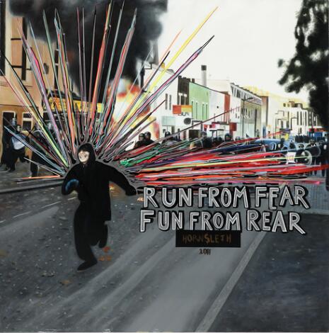 332/37LyngbyKristian von Hornsleth: "Run from fear. Fun from rear", 2011. Signed Hornsleth. Mixed media on canvas. 140 x 140 cm.
