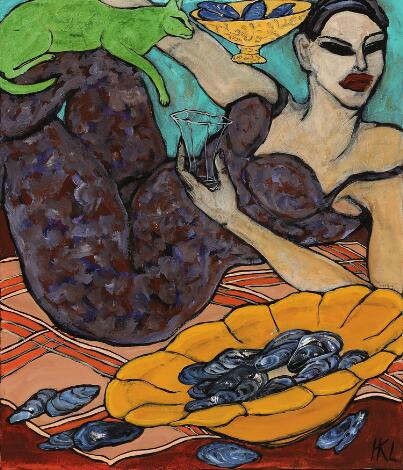 2549/799Karen Kjær Laursen: "Moules a la creme", 2003. Signed KKL. Oil on canvas. 54 x 46 cm.