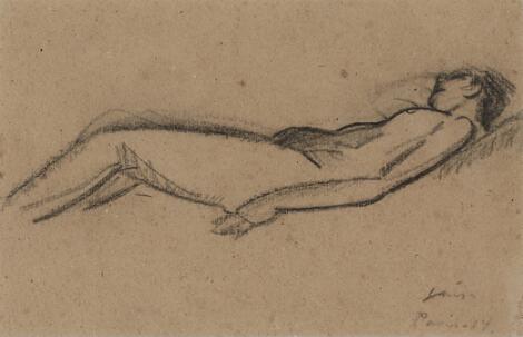 2549/793Jais Nielsen: Woman lying down. Signed Jais, Paris 14. Charcoal on paper. Visible size 17 x 26 cm.