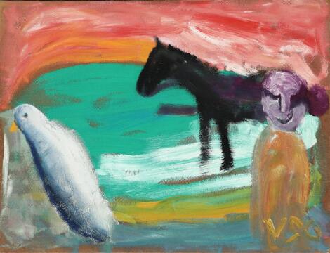 2549/801Wiliam Skotte Olsen: Composition with bird, horse and figure. Signed VSO. Oil on masonite. 53 x 59 cm.