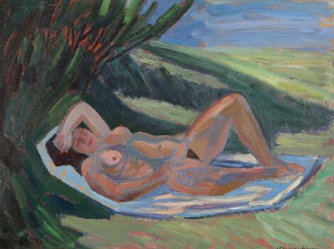 2549/776Anders Gudmundsen-Holmgreen: Reclining female. Signed A. Gudmundsen-Holmgren. Oil on plate. 57 x 75 cm.