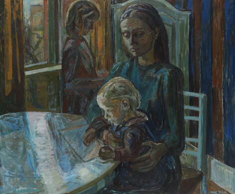 2549/680Paul Høm: Interior with woman and children, 1941. Signed and dated Paul Høm, 41. Oil on canvas. 100 x 120 cm.