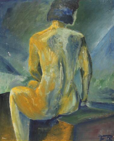 2549/859Painter unkown, 20th century: Backturned woman. Signed FR. Oil on canvas. 55 x 45 cm. Unframed.
