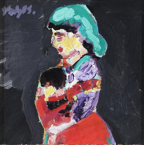 2549/836Hans Voigt Steffensen: "Zigeunerpige med barn'", 1977. Signed. Oil on canvas laid on board. 20 x 20 cm.