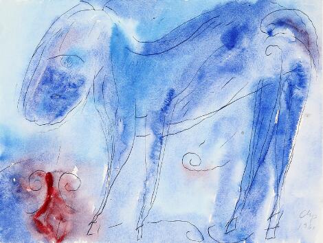 2545/520Carl-Henning Pedersen: "Den blå hest" (The blue horse). Signed CHP 1960. Watercolor and pen on paper. 25 x 33 cm. Unframed.