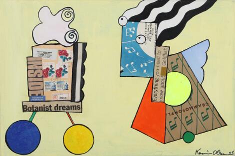 2545/670Karin Olesen: "Botanist Dreams", 2005. Signed and dated. Collage and oil on canvas. 40 x 60 cm. Unframed.