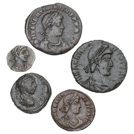 2545/5023Roman Empire, Gratianus, 367-383 and Valentinian II, 375-392, 5 coins, incl. siliqua. (5)