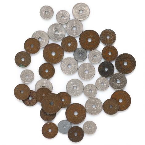Small lot of 10, 25 and 50 øre and 1 kr where the coins either have the wrong hole, are worn or have had some of the obverse/reverse removed, in total 6 pcs
