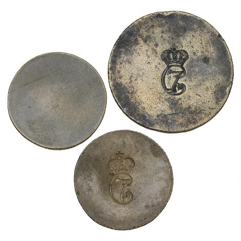 Christian VII, brass wights of 1 speciedaler 1787, 1/3 speciedaler 1787 og 1788, with plain reverse and 2 stamped with crowned C7, in total 3 pcs