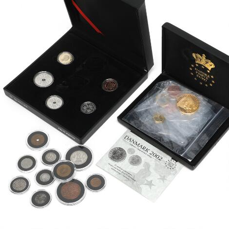 Collection of Danish coins, i.a. proof coin set 2020, Danish Test Euro 2002 in box, 1/6 rigsdaler 1808 "Offermark", H 6, 10 øre 1959, H 10B, etc.