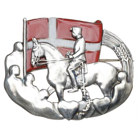 Erik Magnussen og Harald Salomon, “Genforeningsbrochen”, “Der rider en konge”, sterlingsølv prydet med emalje, forstillende Kong Christian X ridende til hest