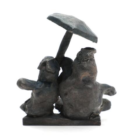 Tobias Henningsen: "Mand og kone under parasol". Signeret TH. Skulptur af patineret bronze. Unik. H. 13.