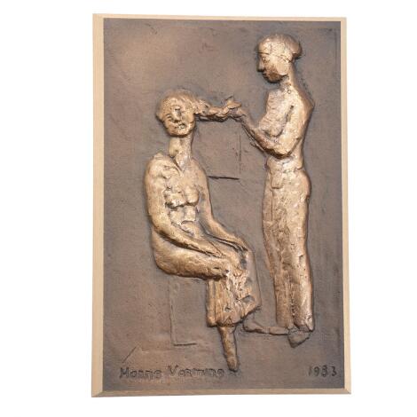 Hanne Varming: "Store børn", 1983. Signeret og dateret. Relief af patineret bronze. 24 x 16 cm.
