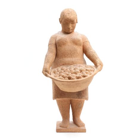 Adam Fischer: Kvinde med frugtfad. Signeret monogram. Uglaseret lertøj. H. 63 cm.