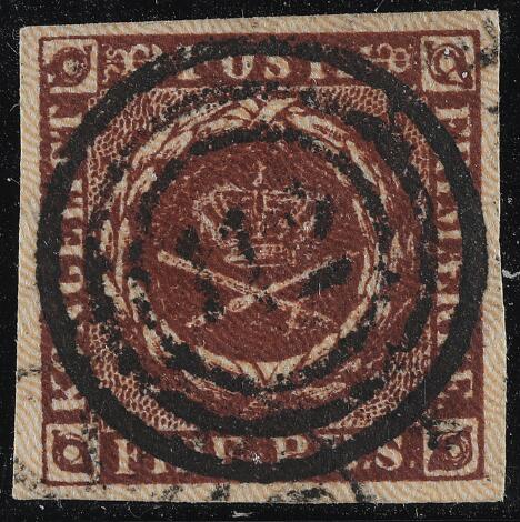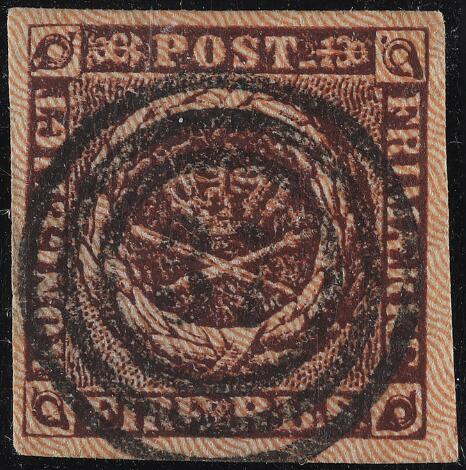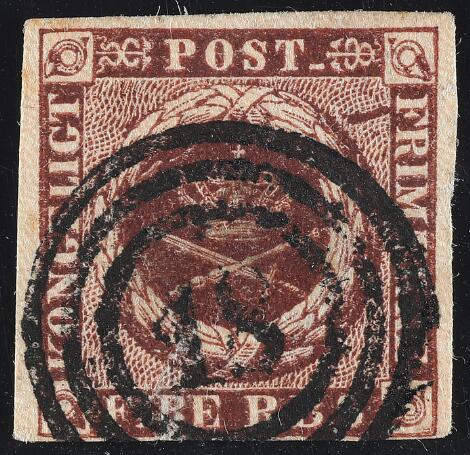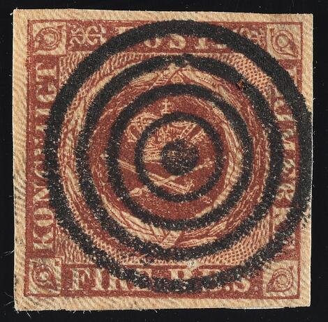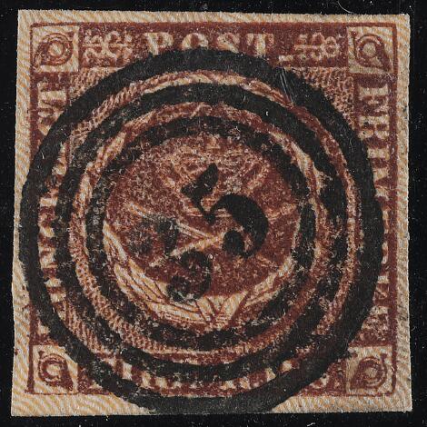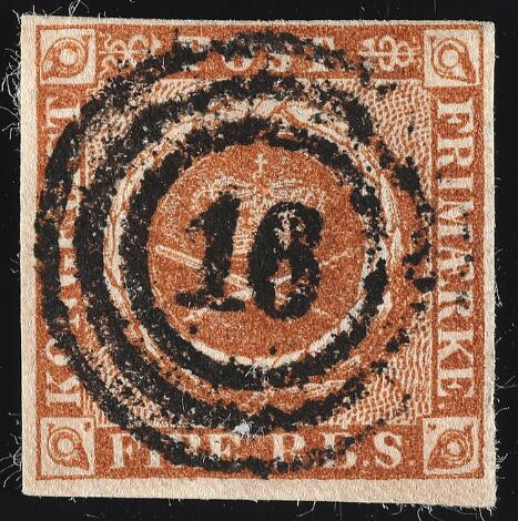 1854. 4 RBS Thiele III, kastaniebrun. Pragteksemplar med helt centrisk nr.stempel 16 (Flensburg)