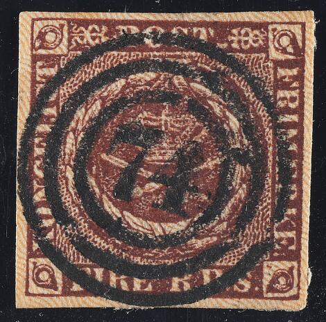 1853. 4 RBS Thiele II, sortbrun. PRAGT-stemplet 74 "TØRRING"