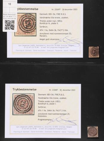 1853. 4 RBS Thiele II, sortbrun. 2 flot stemplede eksemplarer med TB Lars Jørgensen.