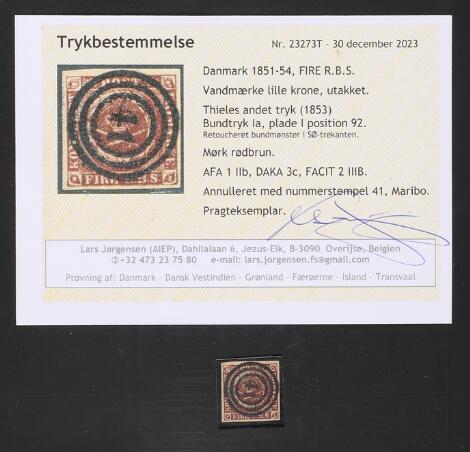 1853. 4 RBS Thiele II, mørk rødbrun, pl. I, nr. 21. PRAGT-mærke stemplet 112 "SÆBY". Attest CAM